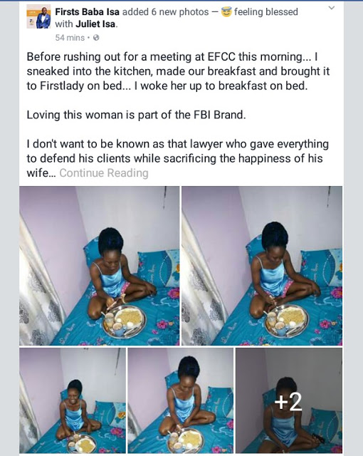 “Before rushing out for a meeting at EFCC this morning… I sneaked into the kitchen, made our breakfast and brought it to Firstlady on bed… I woke her up to breakfast on bed.
